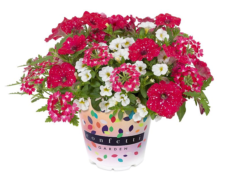 Confetti Gardens are breeder planned mixed containers where the plants are perfectly matched and grow together well all season without any plant taking over any others. This well-matched combination of white Calibrachoa, denim Petunias, and blue charme Verbena is sure to give garden performance all season long.