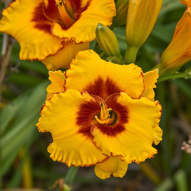 Incredibly vibrant, 4.5-in. (11-cm), golden orange blooms and burgundy eyes. A narrow burgundy edge matches the eye color. This early-midseason bloom is a robust grower with excellent landscape vigor.