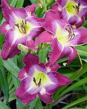 Midseason, 6″ dark burgundy-purple flowers with a triangular pale cream eye and yellow throat, reblooms, tetraploid.