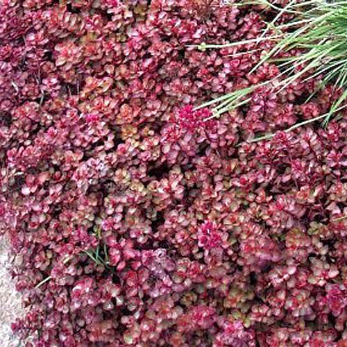 This prostrate groundcover is a deep, bronzy red colour with bright pink mid summer flowers.